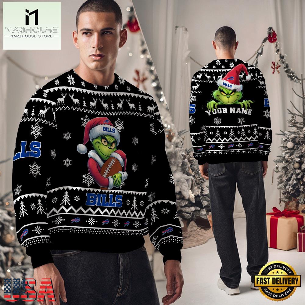Photos Of Buffalo Bills 2025 NFL Grinch Football 2025 Custom Name Ugly Xmas Sweater
