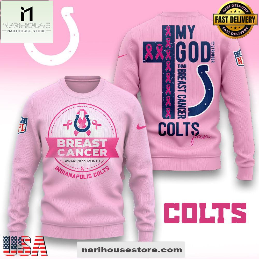 Photos Of Indianapolis Colts NFL My God Is Stronger Than Breast Cancer 2025 Sweatshirt