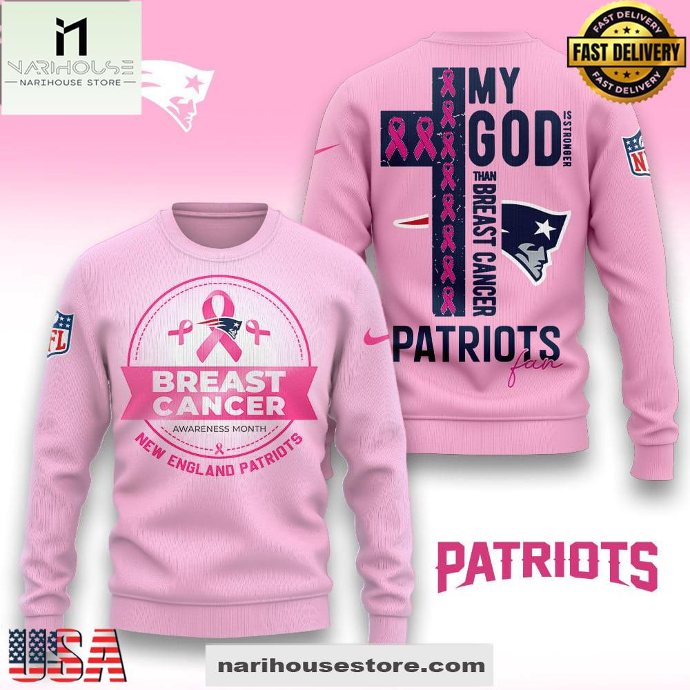 Photos Of New England Patriots NFL My God Is Stronger Than Breast Cancer 2025 Sweatshirt