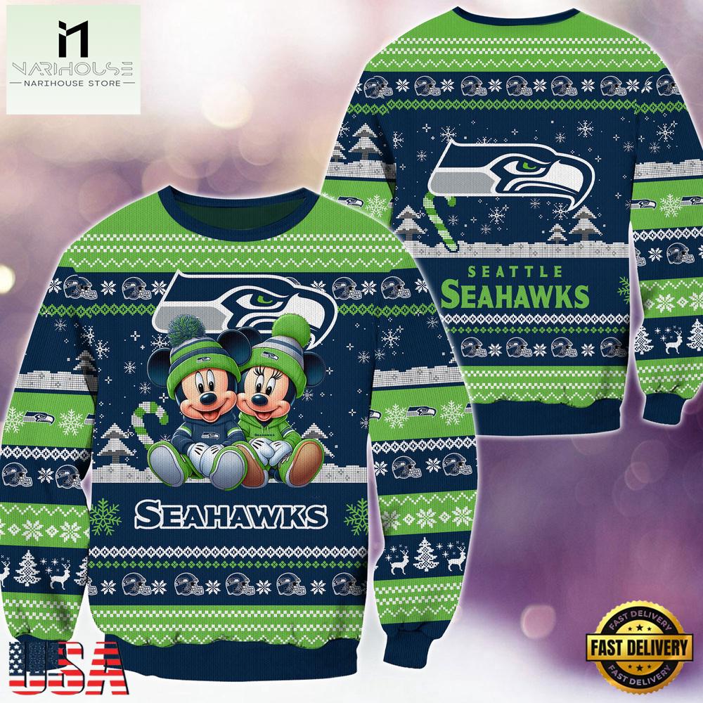 NFL Seattle Seahawks Mickey Minnie New Design 2025 Ugly Xmas Sweater is a Christmas sweater with funny, humorous, and quirky patterns. It will be a meaningful gift for you to show your love and care for your loved ones.